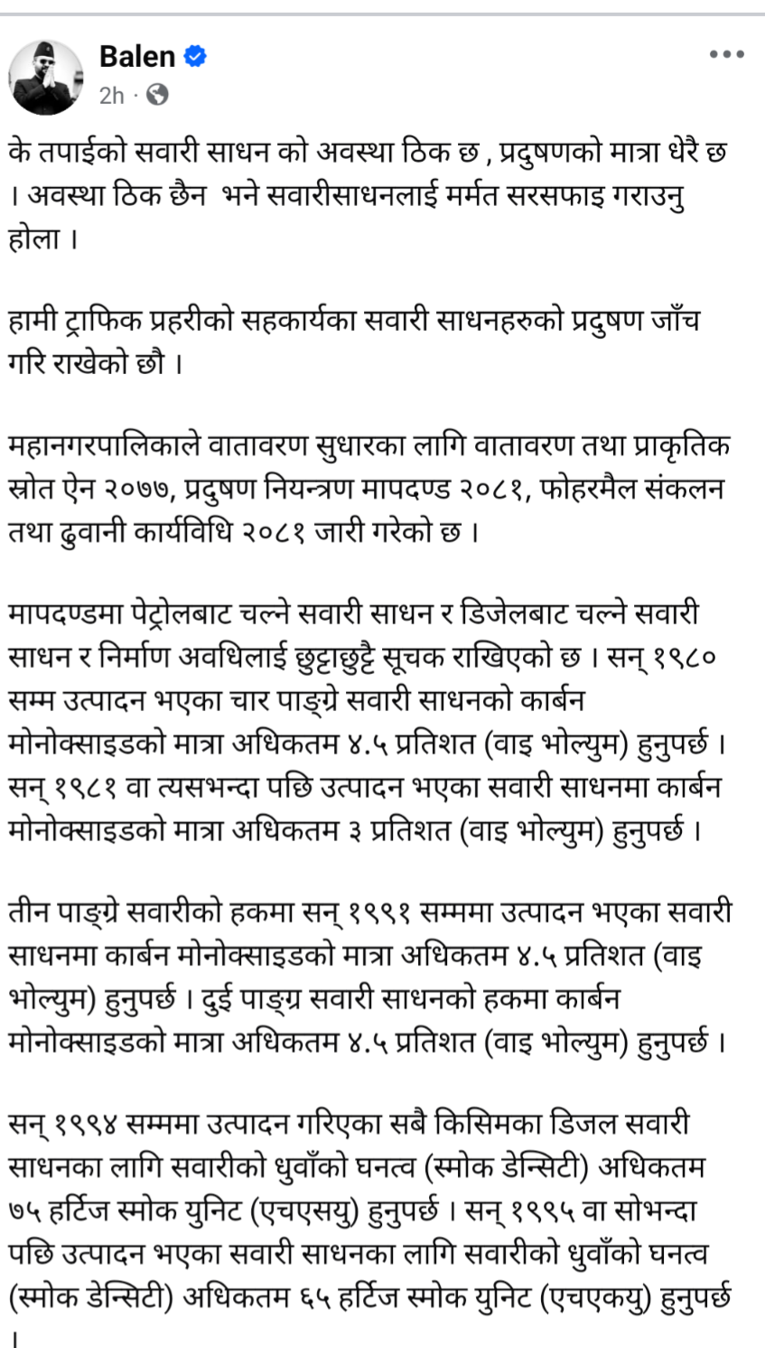 काठमाडौं । काठमाडौं महानगरपालिकाले वातावरणीय सुधारका लागि सवारी साधनको प्रदुषण मापनमा कडा निगरानी सुरु गरेको छ। महानगरपालिकाका मेयर बालेन्द्र शाह (बालेन)ले आफ्नो फेसबुक स्ट्याटस मार्फत यस्ताे जानकारी दिएका हुन्। उनले सवारी साधनको प्रदुषण नियन्त्रण र सरसफाइलाई प्राथमिकतामा राखिएको जानकारी गराएका छन्।