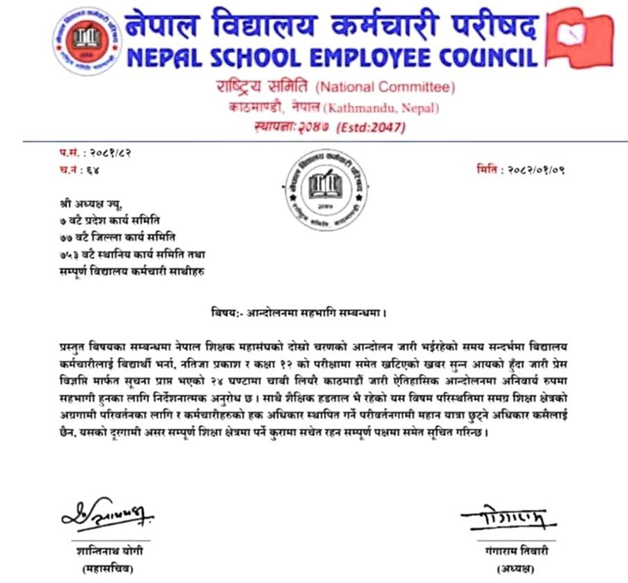 विज्ञप्तिमा भनिएकाे छ ‘कर्मचारीलाई बिद्यार्थी भर्ना, नतिजा प्रकाश र कक्षा १२ को परीक्षामा समेत खटिएको खबर सुन्न आयको हुँदा जारी प्रेस विज्ञप्ति मार्फत सूचना प्राप्त भएको २४ घण्टामा चाबी लिएर काठमाडौं जारी ऐतिहासिक आन्दोलनमा अनिवार्य रुपमा सहभागी हुनका लागि निर्देशनात्मक अनुरोध छ,’ ।