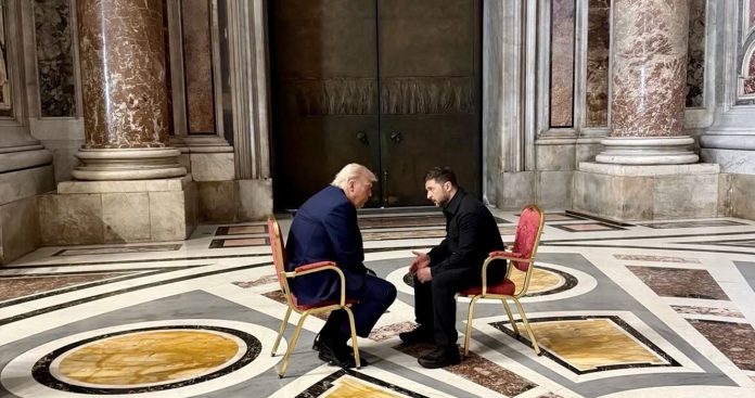 इटालीको राजधानी रोममा ट्रम्प र जेलेन्स्कीबीच भेटवार्ता भएको अन्तर्राष्ट्रिय सञ्चारमाध्यमहरूले जनाएका छन्। क्याथोलिक चर्चका प्रमुख पोप फ्रान्सिसको अन्त्येष्टिमा सहभागी हुन रोम पुगेका उनीहरूले १५ मिनेट वान टु वान भेटवार्ता गरेको अन्तर्राष्ट्रिय सञ्चारमाध्यमहरुले जनाएका छन्।