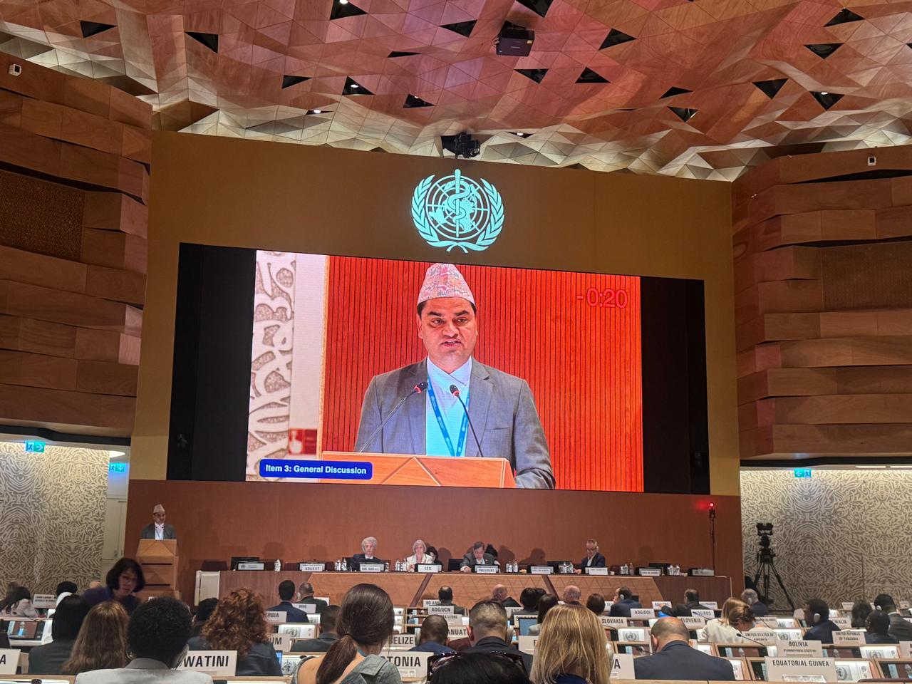 नेपालले खोपको पहुँच विस्तारमा समेत प्रगति गरेको उल्लेख गर्दै पोलियो उन्मुलनसँगै सबै तहमा आधारभूत स्वास्थ्य सेवा विस्तार गरेको उल्लेख गरेका छन् । ‘महिला सामाजिक स्वास्थ्य स्वयंसेविका तथा विद्यालय स्वास्थ्य कार्यक्रममार्फत सकारात्मक नतिजा प्राप्त गरेका छौं,’ मन्त्री पौडेलले भने । सूर्तीजन्य पदार्थको प्रयोग नियन्त्रणमा नेपालले पहल थालेको भन्दै मन्त्री पौडेलले यसले सकारात्मक नतिजा दिने विश्वास गरे । नेपालले स्वास्थ्य बीमा कार्यक्रम लागु गरेको चर्चा गर्दै उनले निरोधात्मक स्वास्थ्य सेवा, महामारी पूर्वतयारी तथा डिजिटल स्वास्थ्यमा समेत जोड दिएको मन्त्री पौडेलले उल्लेख गरे । जलवायु परिवर्तनको स्वास्थ्यमा प्रभावबारे ध्यानाकर्षण नेपालसामु बढिरहेको वृद्ध जनसंख्या, न्यून जन्मदर, आन्तरिक बसाईसराई तथा नसर्ने रोग र मानसिक रोगजस्ता स्वास्थ्य चुनौती खडा भएकाले यसको सामनाका लागि विश्व समुदायसँग सहकार्यका लागि आग्रह गरे ।
