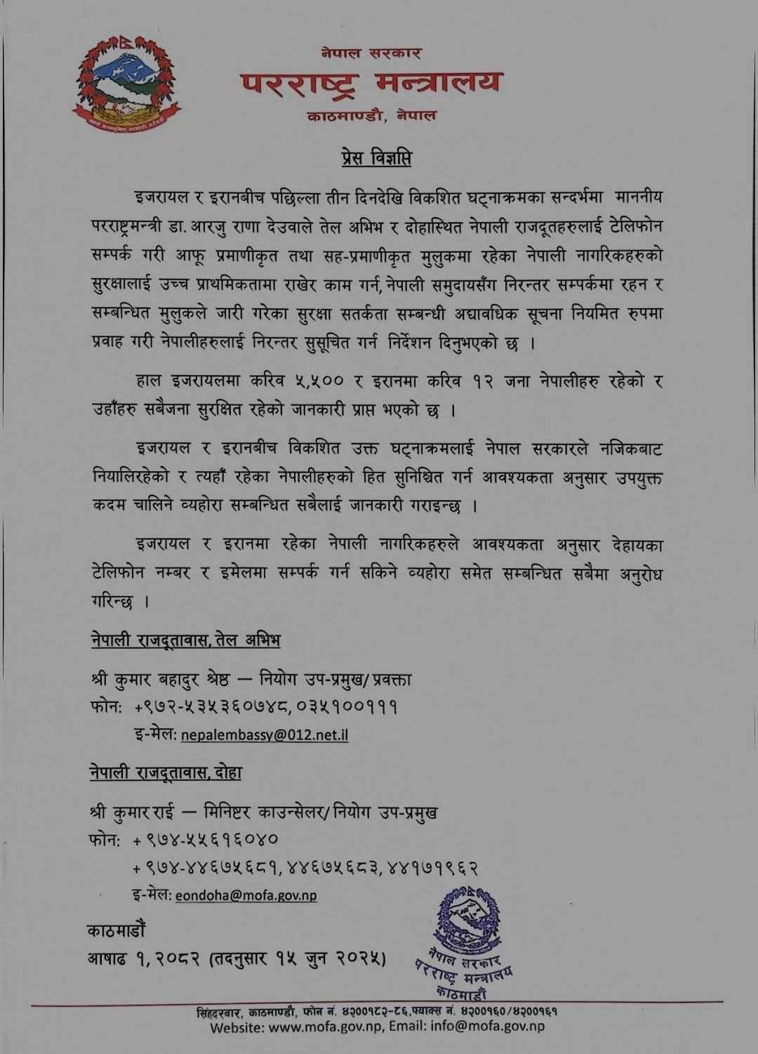 यसैबीच परराष्ट्र मन्त्री आरजु राणा देउवाले तेल अभिभ र दोहास्थित नेपाली राजदूतहरूलाई टेलिफोन सम्पर्क गरेर नेपाली नागरिकहरूको सुरक्षालाई उच्च प्राथमिकतामा राखेर काम गर्न निर्देशन दिएकी छन्।