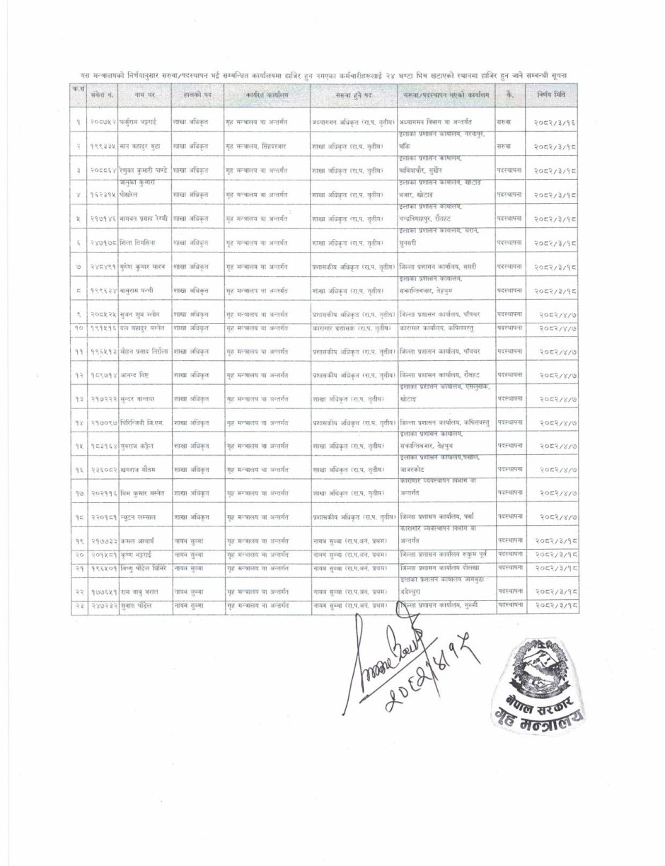शुक्रबार मन्त्रालयले २३ जनाको सूची सार्वजनिक गर्दै २४ घण्टाभित्र सरूवा गरेको स्थानमा हाजिर हुन जान भनिएको हो। सूचनामा मन्त्रालयको विभिन्न मितिको निर्णयानुसार सरूवा/पदस्थापन भई सम्बन्धित कार्यालयमा हाजिर हुन नगएका कर्मचारीहरूलाई २४ घण्टा भित्र खटाइएको स्थानमा हाजिर हुन जान भनिएकाे छ।
