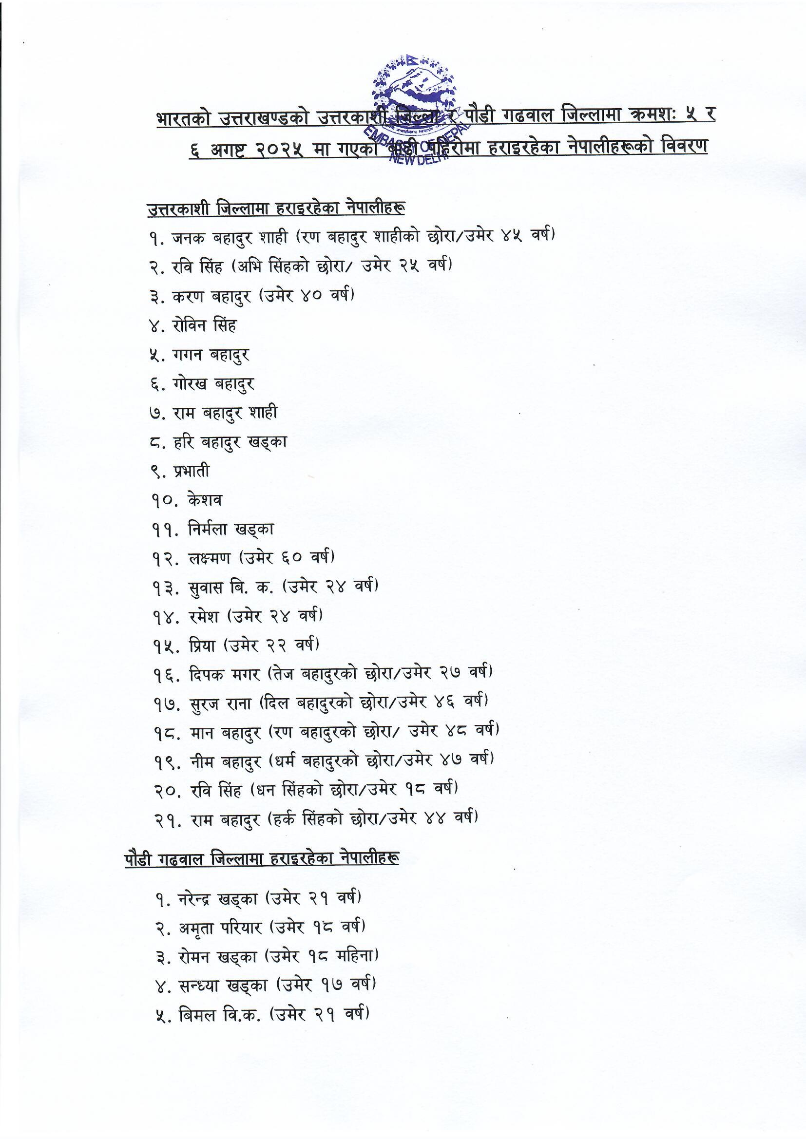 दूतावासले बेपत्ताहरूको सूची सार्वजनिक गर्दै उत्तर काशीमा २१ र पौडी गढवालमा ५ नेपाली बेपत्ता रहेको विज्ञप्तिमार्फत जानकारी गराएको छ ।