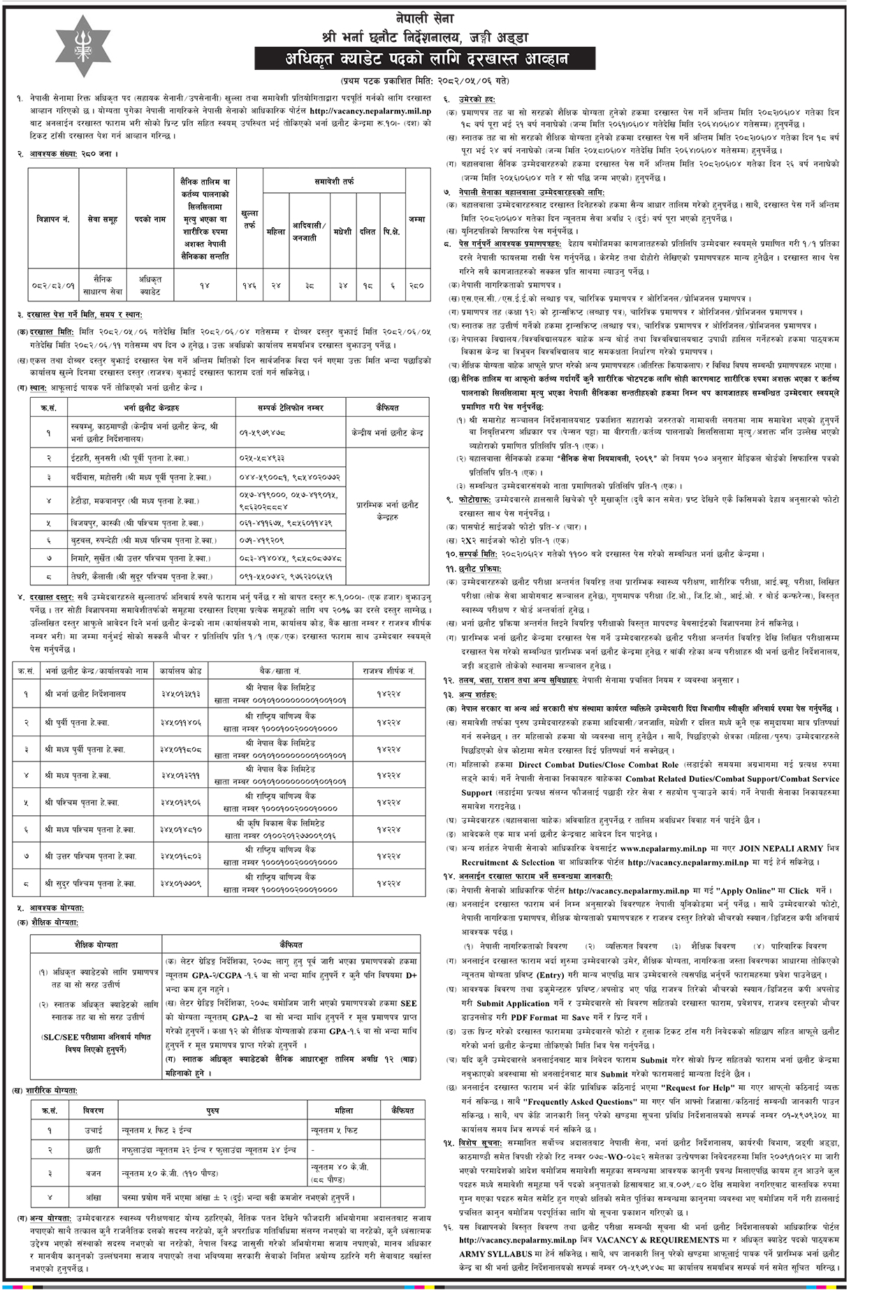 जसअनुसार खुलातर्फ १४६ जना र सैनिक तालिम वा कर्तव्य पालनाको सिलसिलामा मृत्यु भएका वा शारीरिक रुपमा अशक्त नेपाली सैनिकका सन्ततिका लागि १४ जनाको लागि कोटा छ ।