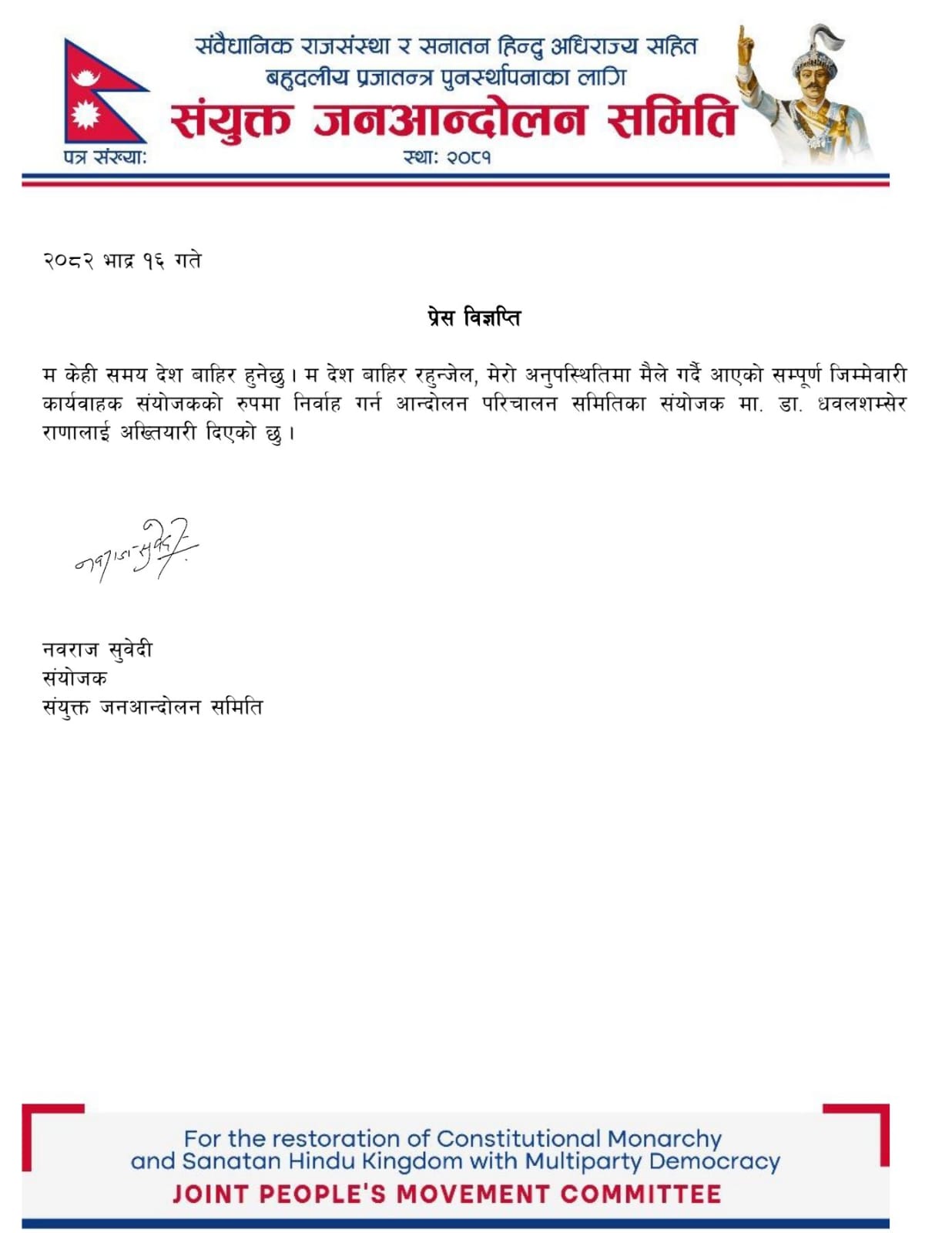 १६ भदौ,काठमाडौं । राजसंस्था पुनर्स्थापनाका लागि भन्दै गठन गरिएको संयुक्त जनआन्दोलन समिति संयोजक नवराज सुवेदीले कार्यवाहक संयोजकको जिम्मेवारी धवल शमशेर राणालाई दिएका छन् । सुवेदीले केही समय आफू देश बाहिर रहने हुनाले राष्ट्रिय प्रजातन्त्र पार्टी (राप्रपा)का महामन्त्री डा. राणालाई कार्यवाहक जिम्मेवारी दिएका हुन् ।