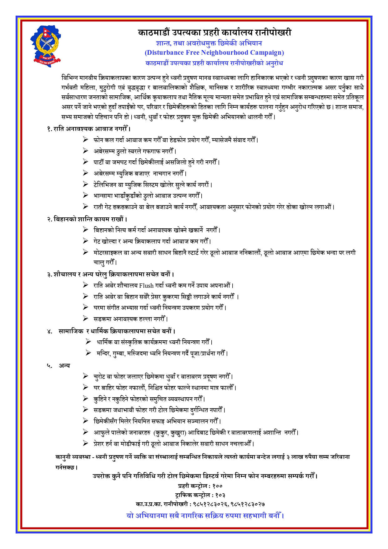 काठमाडौं । काठमाडौं उपत्यका प्रहरी कार्यालयले शान्त छिमेकी अभियान सञ्चालन गरेकाे छ।