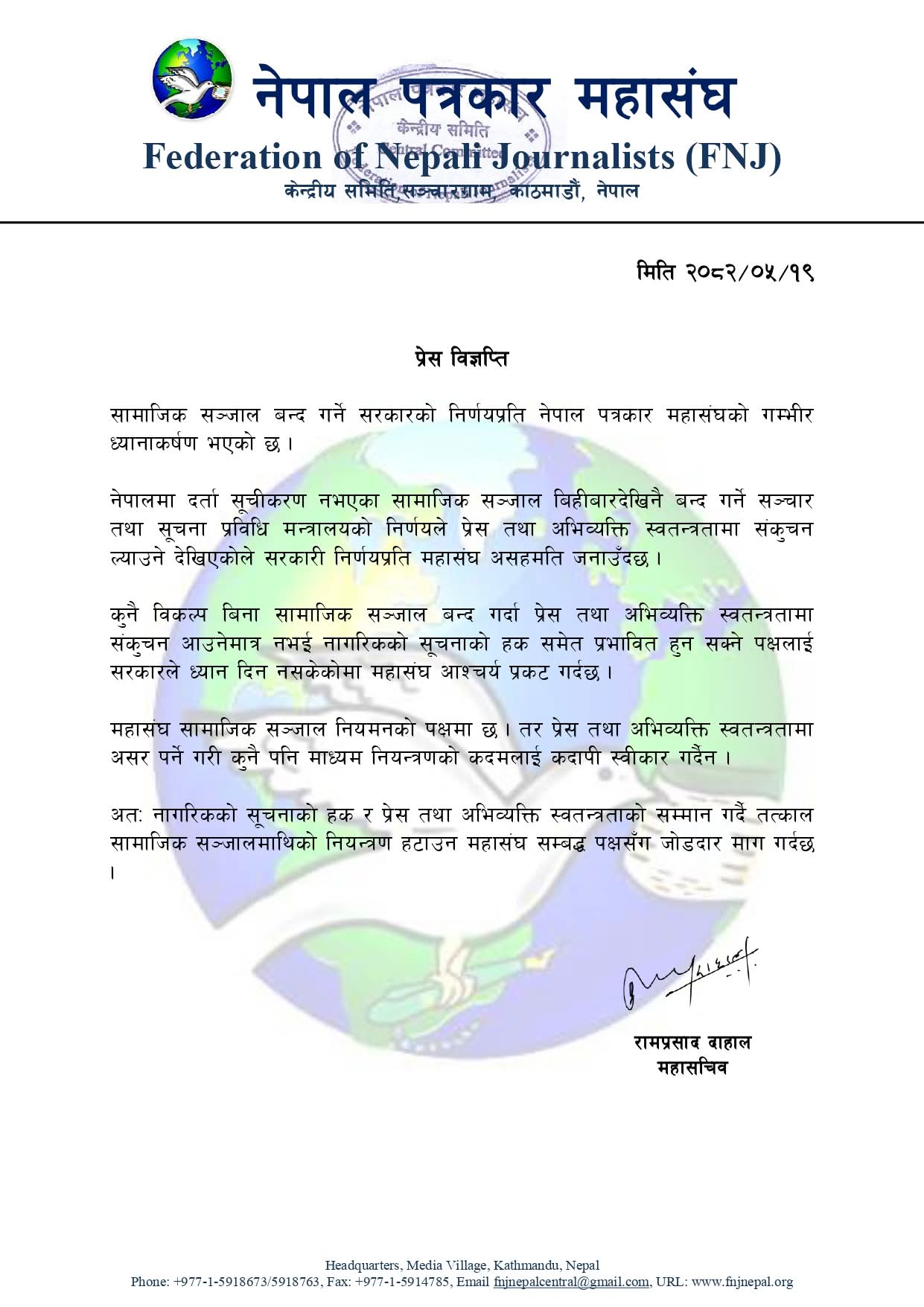 ‘नेपालमा दर्ता सूचीकरण नभएका सामाजिक सञ्जाल बिहीबारदेखिनै बन्द गर्ने सञ्चार तथा सूचना प्रविधि मन्त्रालयको निर्णयले प्रेस तथा अभिव्यक्ति स्वतन्त्रतामा संकुचन ल्याउने देखिएकोले सरकारी निर्णयप्रति महासंघ असहमति जनाउँदछ,’ विज्ञप्तिमा भनिएको छ, ‘कुनै विकल्पबिना सामाजिक सञ्जाल बन्द गर्दा प्रेस तथा अभिव्यक्ति स्वतन्त्रतामा संकुचन आउनेमात्र नभई नागरिकको सूचनाको हक समेत प्रभावित हुन सक्ने पक्षलाई सरकारले ध्यान दिन नसकेकोमा महासंघ आश्चर्य प्रकट गर्दछ।’