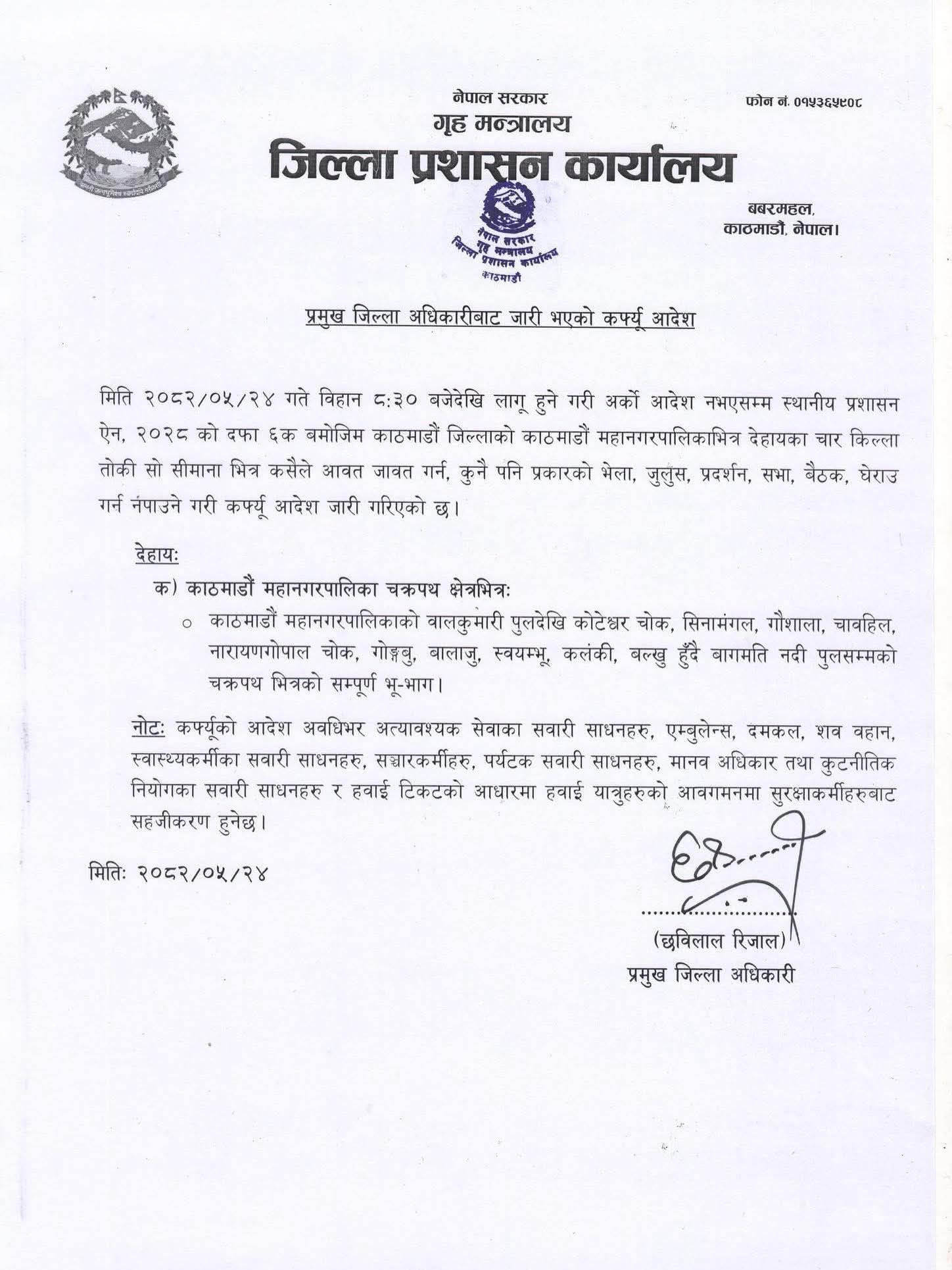 प्रजिअ रिजालका अनुसार काठमाडौं महानगरपालिकाको बालकुमारी पुलदेखि कोटेश्वर चोक, सिनामंल, गौशाला, चाबहिल, नारायणगोपाल चोक, गोंगबु, बालाजु, स्वयम्भु, कलंकी, बल्खु हुँदै बागमती नदी पुलसम्मको चक्रपथभित्रको सम्पूर्ण भूभागमा कर्फ्यु लगाइएको हो ।
