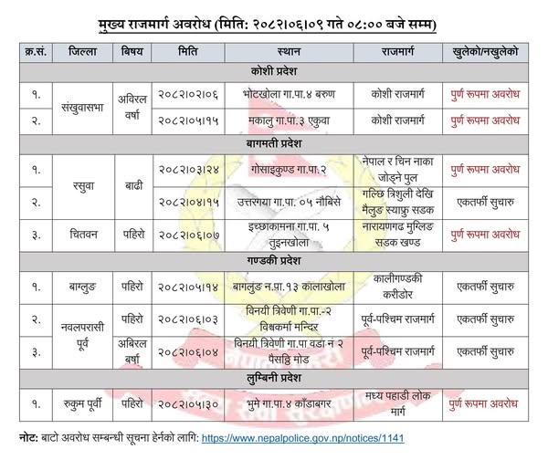 त्यस्तै, रसुवाको गोसाइँकुण्ड गाउँपालिका २ पासाङल्हामु राजमार्गस्थित नेपाल चीन जोड्ने मितेरी पुल, चितवनको इच्छाकामना गाउँपालिका ५ स्थित मुग्लिङ-नारायणघाट सडकखण्ड र रुकुम पूर्वको भूमे गाउँपालिका ४ स्थित मध्यपहाडी लोकमार्ग पूर्ण रूपमा अवरुद्ध भएका केन्द्रीय प्रहरी प्रवक्ता एवं प्रहरी नायब महानिरीक्षक विनोद घिमिरेले जानकारी दिए ।
