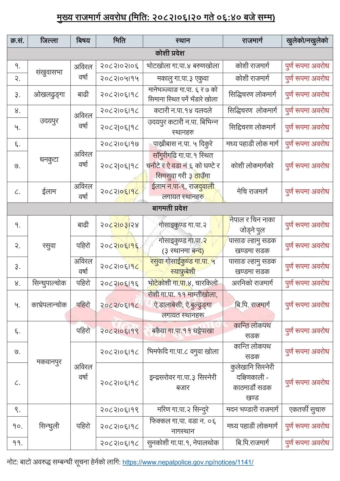 त्यसैगरी बागमती प्रदेशमा पासाङ ल्हामु सडक, अरनिको राजमार्ग, बीपी राजमार्ग, कान्ति लोकपथ, मदन भण्डारी राजमार्ग, मध्यपहाडी लोकमार्गहरु बन्द छन् ।