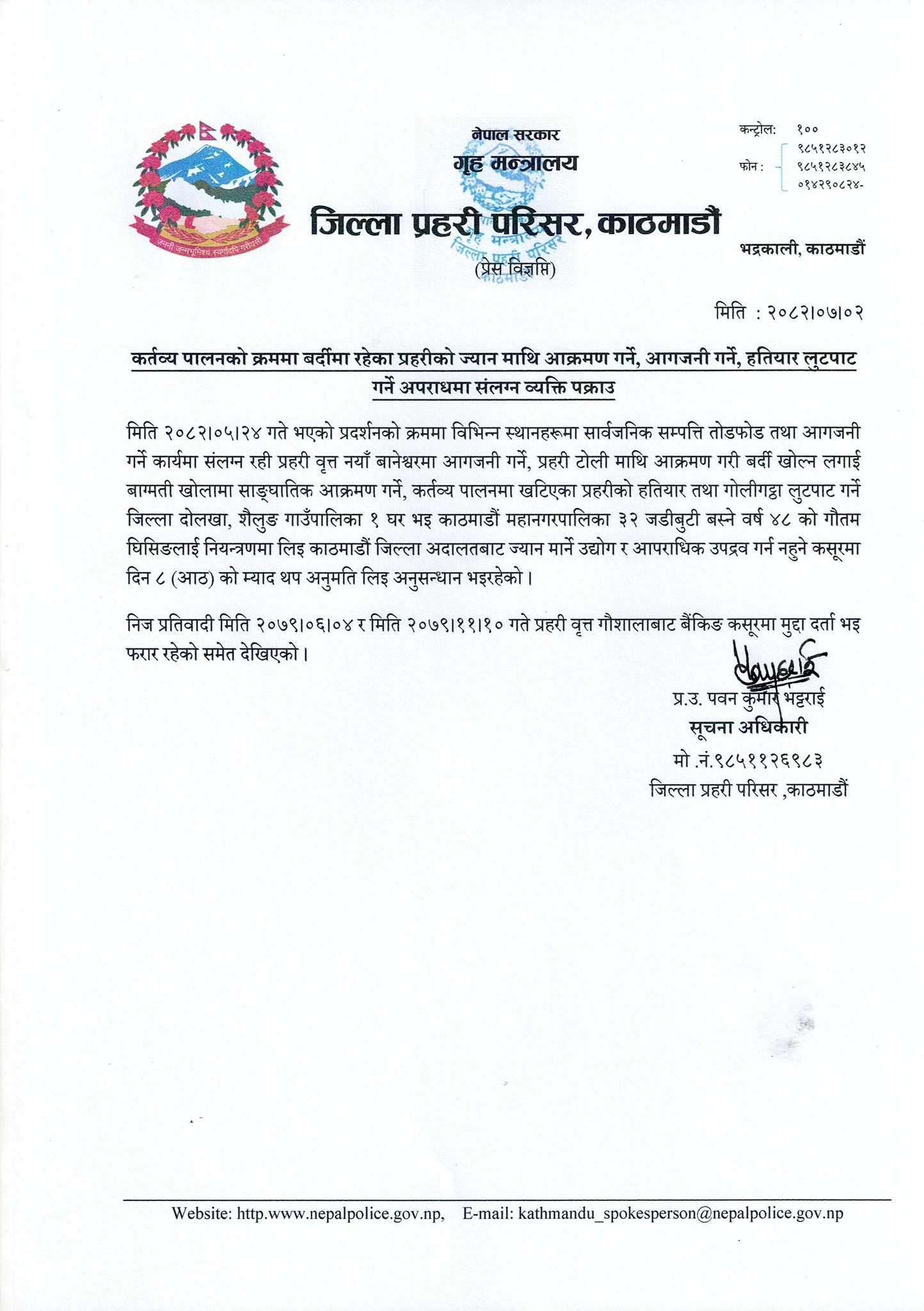 २ कात्तिक, काठमाडौं । २४ भदौको जेनजी प्रदर्शनका क्रममा प्रहरीमाथि आक्रमण गर्दै हतियार लुटपाटमा संलग्न रहेको आरोपमा एक जना पक्राउ परेका छन् ।