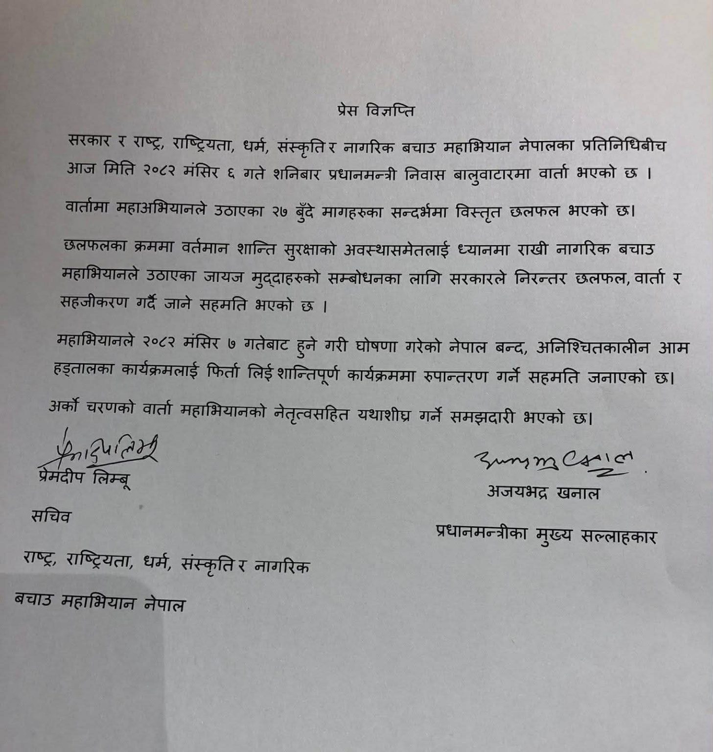 महाभियानले २०८२ मंसिर ७ गतेबाट हुने गरी घोषणा गरेको नेपाल बन्द, अनिश्चितकालीन आम हड्ताल लगायतका कार्यक्रम घोषणा गरेको थियो ।