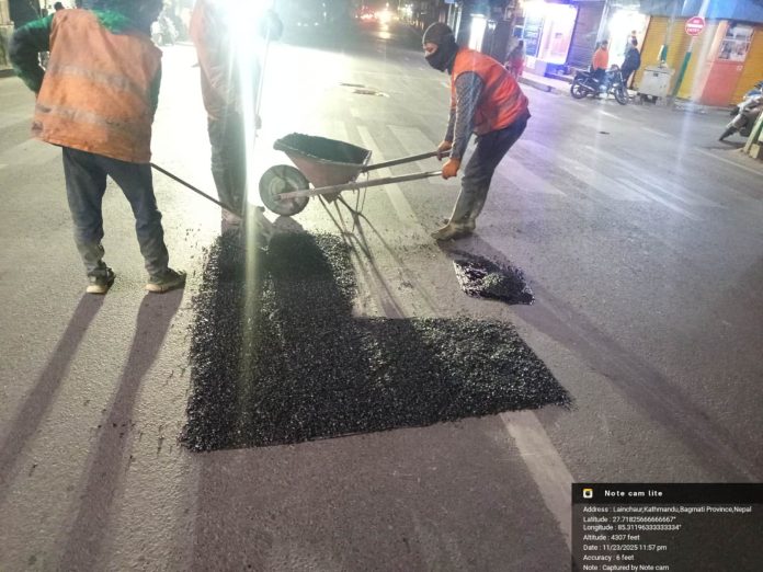 ८ मंसिर, काठमाडौं । सधै आर्थिक वर्षको अन्त्यतिर आएर काठमाडौंको सडकका खाल्डा खुल्डी पुर्ने प्रवृत्ति सडकले यस पटक सच्याएको छ । सडक डिभिजन काठमाडौंले यस पटक हिउँद याममै यस्तो कामलाई तिव्रता दिएको हो । रातको चिसो मौसममा कामदार फिल्डमा खटिएको देख्न सकिन्छ । भौतिक मन्त्री कुलमान घिसिङको सक्रियताले यतिबेला पूर्वाधारको क्षेत्रमा निकै परिवर्तत आएको देख्न सकिन्छ ।