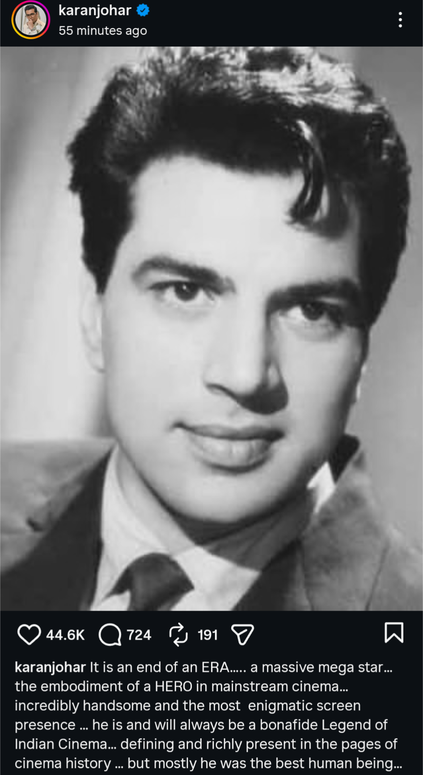 यसै बलिउड फिल्म निर्माता करण जोहरले अभिनेता धर्मेन्द्रको निधन भएको पुष्टि गर्दै सामाजिक सञ्जालमार्फत श्रद्धाञ्जलि व्यक्ति गरेका छन् ।