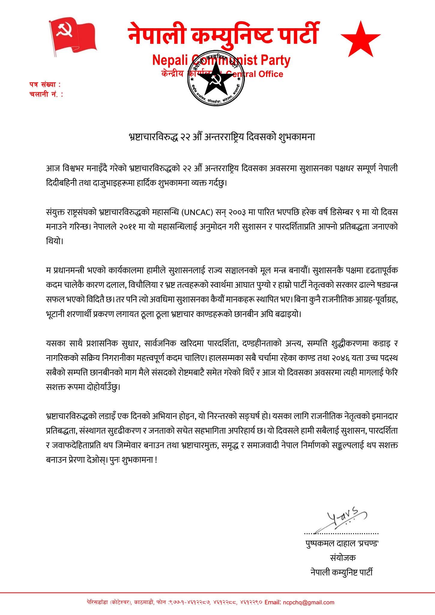 २३ मंसिर, काठमाडौं । नेपाली कम्युनिस्ट पार्टी (नेकपा) का संयोजक पुष्पकमल दाहाल प्रचण्डले २०४६ यता उच्च पदमा पुगेका सबैको सम्पत्ति छानबिन हुनुपर्ने माग राखेका छन्। भ्रष्टाचार विरुद्धको २२औँ अन्तर्राष्ट्रिय दिवसका अवसरमा मंगलबार शुभकामना सन्देश दिँदै उनले यस्तो माग राखेका हुन् ।