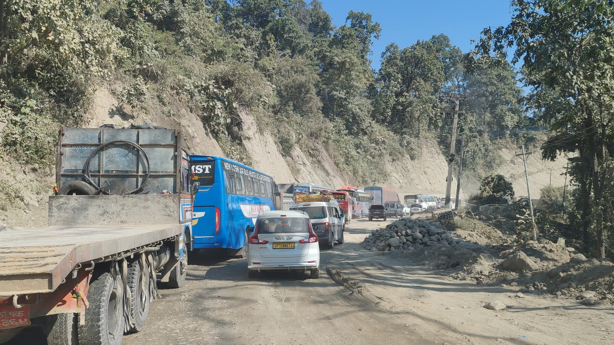 दाउन्ने खण्डको दुम्कीबास र बर्दघाट दुवैतिर गाडीहरुको लामो लाइन छ ।