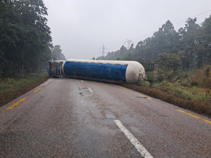 भारतको रक्सौलबाट एलपी ग्यास बोकेर धनुषाको महेन्द्रनगरतर्फ जाँदै गरेको युपी १७ ए टी २११४ नम्बरको ट्याङ्कर आज बिहान दुर्घटना भएको हो । अवरुद्ध राजमार्ग बिहानैदेखि खुलाउने प्रयास भए पनि प्राविधिक कारणले खुलाउन नसकिएको इलाका प्रहरी कार्यालय चन्द्रनिगाहपुरकी प्रहरी नायब उपरीक्षक रुपा लाबुङले जानकारी दिइन् ।