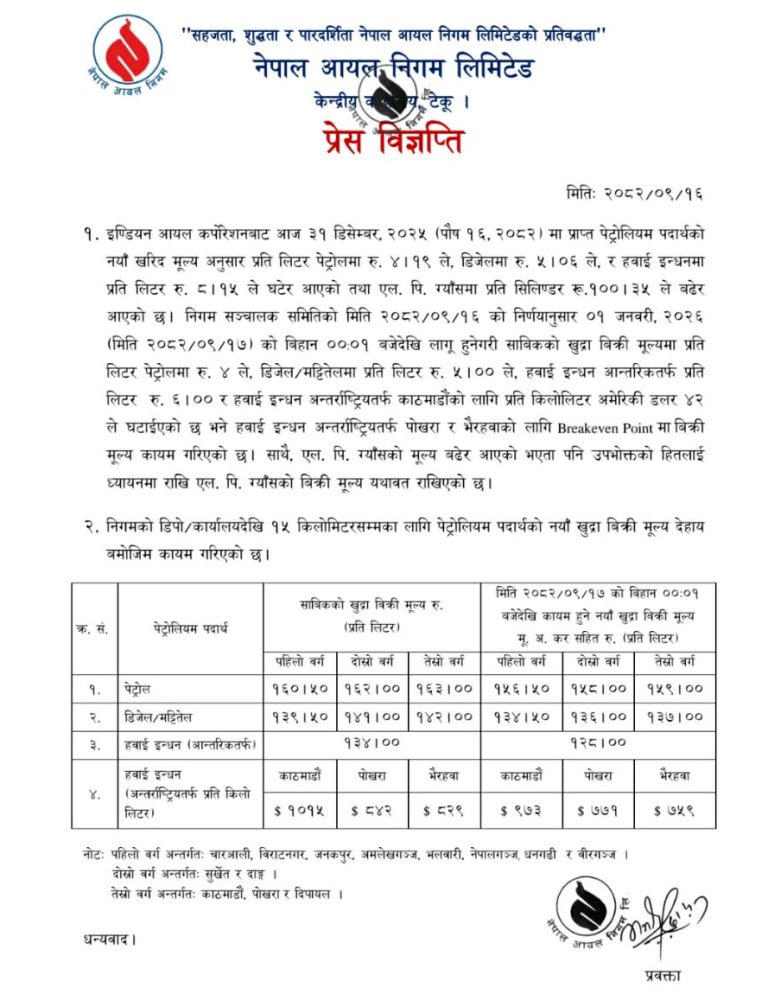 १६ पुस, काठमाडौं । पेट्रोलियम पदार्थको मूल्य घटेको छ । नेपाल आयल निगमले आज राति १२ बजेबाट लागू हुनेगरी पेट्रोलियम पदार्थको मूल्य घटाएको जानकारी गराएको छ । निगमका अनुसार, पेट्रोलमा ४ रुपैयाँ, डिजेल–मट्टितेलमा ५ रुपैयाँका दरले मूल्य घटाइएको छ ।