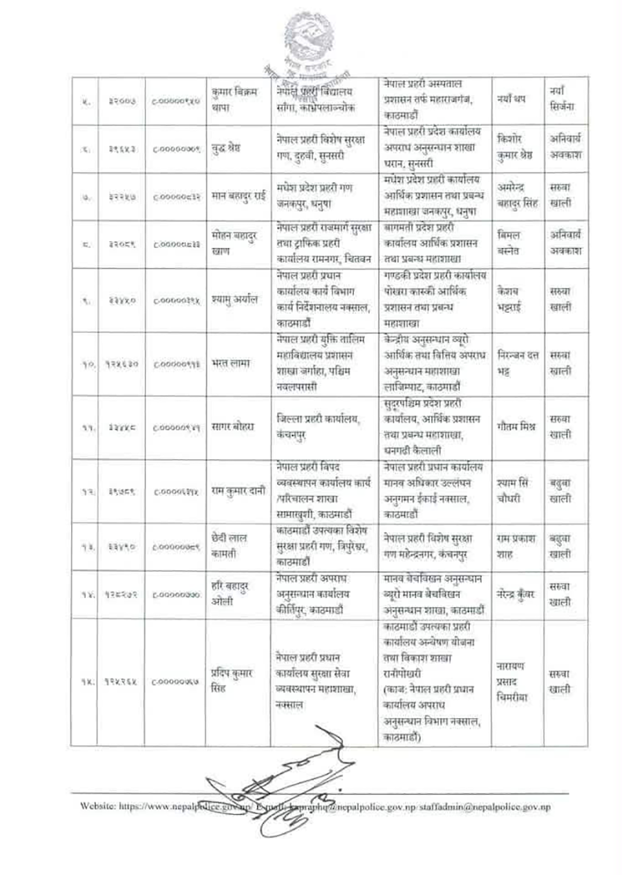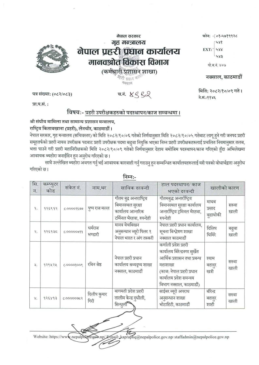 गृह मन्त्रालयको सचिव स्तरीय निर्णय अनुसार ५ माघदेखि लागु हुने गरी एसपी हरुकाे पदस्थापना गरेकाे हाे। जनपद प्रहरी समूह तर्फको प्रहरी नायव उपरीक्षक पदबाट प्रहरी उपरीक्षक पदमा बढुवा नियुक्ति भएका एसपीहरूको पदस्थापना गरिएको हाे।