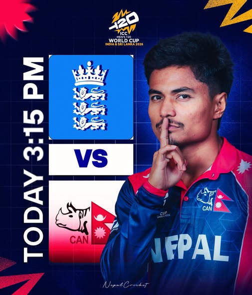 २५ माघ, काठमाडौं । आईसीसी टी–२० विश्वकप २०२६ को आफ्नो पहिलो खेलमा नेपालले बलियो टोली इंग्ल्यान्डसँग खेल्दै छ । आइतबार नेपाली समय अनुसार सवा ३ बजे खेल सुरु हुनेछ । शनिबारदेखि सुरु प्रतियोगिताको पहिलो दिन तीन खेल भएका छन् ।