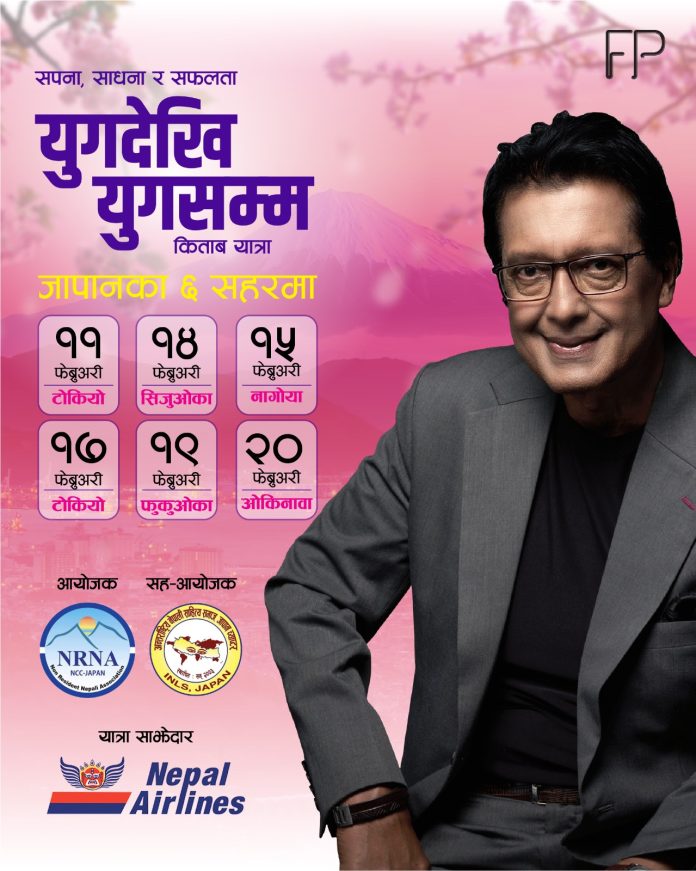 काठमाडौं । महानायक राजेश हमालले जापानका ६ सहरमा आफ्नो पुस्तक ‘युगदेखि युगसम्म’को बुक–टुर गर्ने भएका छन् । एनआरएनए–जापानको आयोजनामा जापानका ६ सहर टोकियो, सिजुओका, नागोया, ओसाका, फुकुओका र ओकिनावामा हुने ‘युगदेखि युगसम्म ः सपना, साधना र सफलता’ शीर्षक कार्यक्रममा महानायक हमाल सहभागी हुने भएका हुन् ।