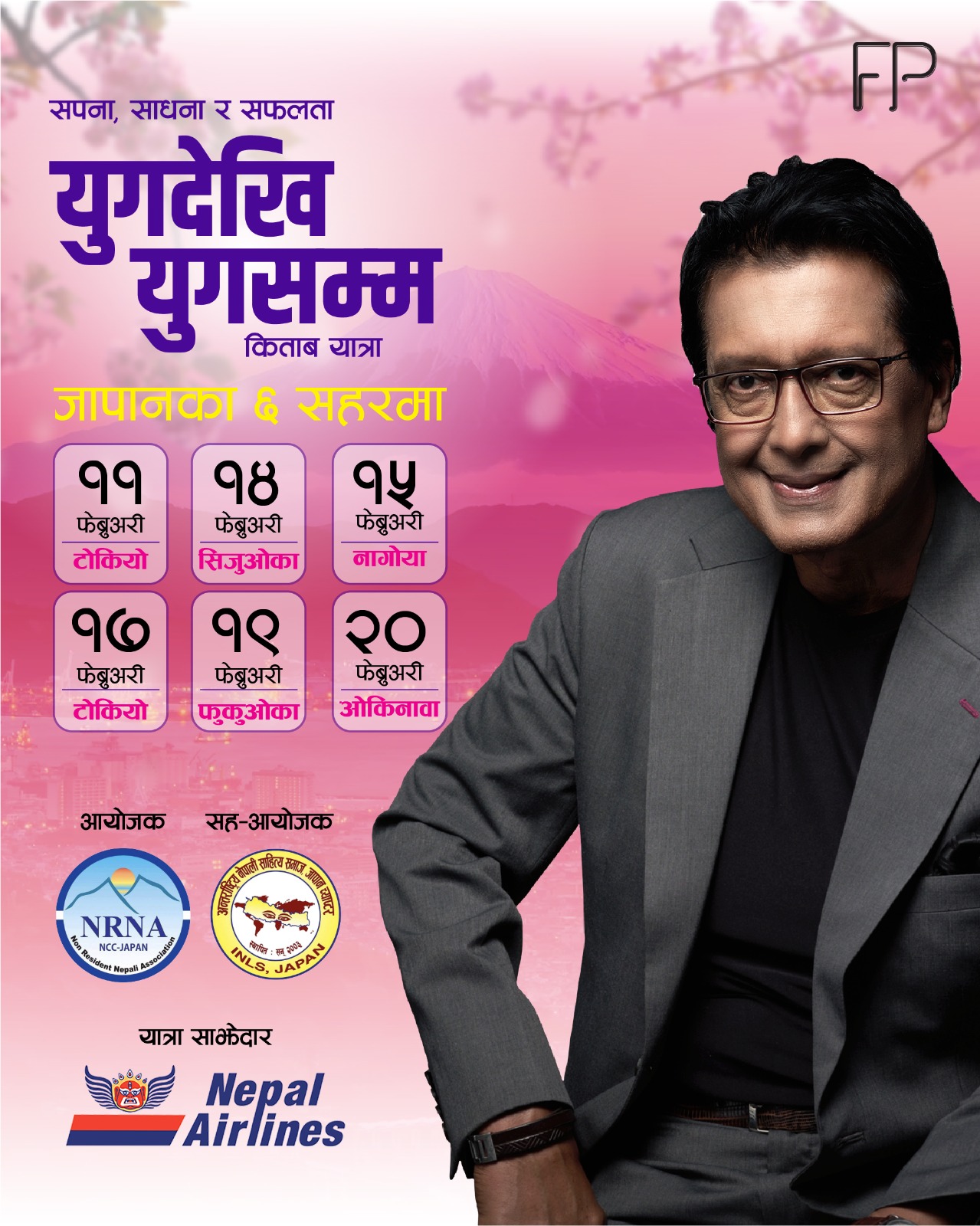 अन्तर्राष्ट्रिय नेपाली साहित्य समाज (अनेसास–जापान) को सहआयोजना एवं फाइनप्रिन्ट बुक्सको पहल र नेपाल एयरलाइन्सको सहयोगमा हुन लागेको कार्यक्रम ११ फेबु्रअरीमा टोकियो, १४ फेब्रुअरीमा सिजुओका, १५ फेबु्रअरीमा नागोया, १७ फेबु्रअरीमा ओसाका, १९ फेबु्रअरीमा फुकुओका र २० फेब्रुअरीमा ओकिनावामा हुनेछ ।