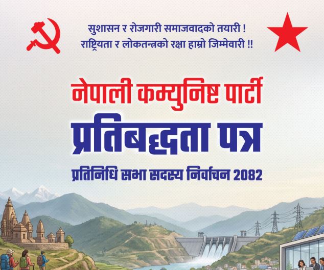 काठमाडौँ, २७ माघ । नेपाली कम्युनिष्ट पार्टीले आसन्न प्रतिनिधिसभा सदस्य निर्वाचनलाई केन्द्रित गरेर चुनावी प्रतिबद्धतापत्र सार्वजनिक गरेको छ । पार्टी मुख्यालय पेरिसडाँडामा आज अपराह्न पत्रकार सम्मेलनमार्फत संयोजक पुष्पकमल दाहाल ‘प्रचण्ड’ले प्रतिबद्धतापत्र सार्वजनिक गरे । प्रतिबद्धतापत्रमा केही महत्वाकाङ्क्षी योजनासमेत सार्वजनिक गरिएका छन् । भौतिक पूर्वाधार, शिक्षा, स्वास्थ्यलगायत क्षेत्रमा पाँच वर्षभित्र रणनीतिक योजना कार्यान्वयन गरेर विशेष उपलब्धि हासिल गरिने विषय उल्लेख छ ।