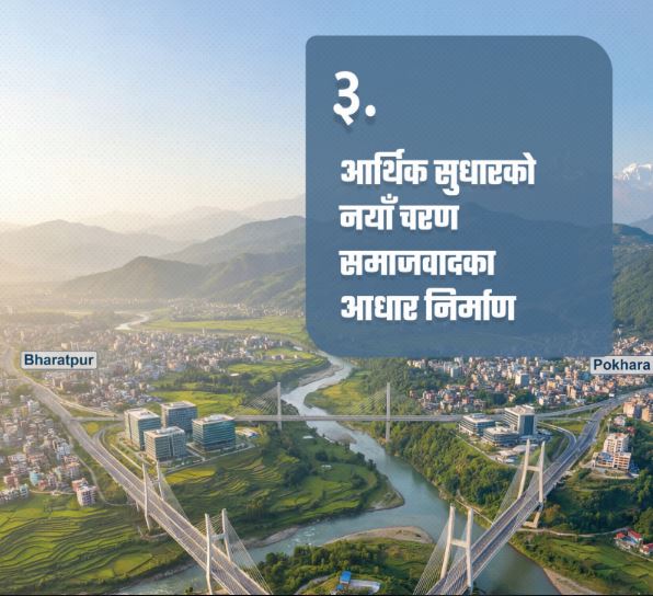 प्रतिबद्धतापत्रमा आर्थिक सुधारको नयाँ चरणलाई विशेष जोड दिइएको छ । आयात–व्यापार तथा उपभोगमुखी अर्थतन्त्रबाट उत्पादनमुखी, आत्मनिर्भर तथा समावेशी मोडलमा ‘सिफ्ट’ गर्ने विषयलाई प्रतिबद्धता पत्रमा समेटिएको छ । ‘नयाँ चरणको आर्थिक सुधार’ र सामाजिक न्यायसहितको समृद्धिलाई विशेष जोड दिएर पार्टीले स्वाधिन र समृद्ध नेपाल निर्माणको मार्गचित्र तयार गर्ने गर्ने अग्रसरता लिएको छ । राजनीतिक स्थायित्व, सुशासन र परिणाममुखी प्रशासनका लागि विशेष पहल गर्ने प्रतिबद्धता पत्रमा व्यक्त गरिएको छ । सार्वजनिक, सहकारी र निजी क्षेत्रको सहकार्यमा तीनखम्बे आर्थिक नीति अवलम्बन गरिनेछ ।